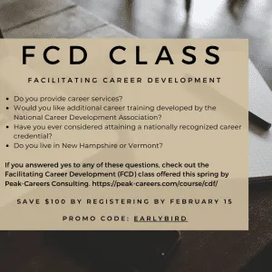 For career practitioners interested in becoming trained, certified career professionals. Hybrid course with 5-live classes. Can be done completely using zoom.